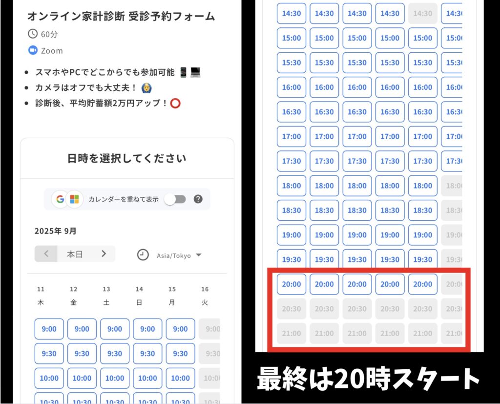 - 予約できる日に限りがあるため、次の回まで時間が空く可能性もある。