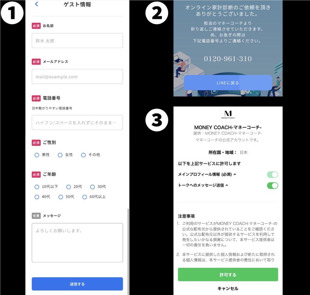 だけ入力して送信。LINEの登録へ誘導されるので「許可する」。